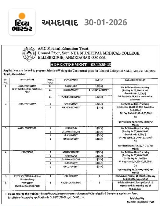 AMC મેડિકલ એજ્યુકેશન ટ્રસ્ટ, અમદાવાદે તેના મેડિકલ કોલેજો માટે વિવિધ વિભાગોમાં શૈક્ષણિક અને કોન્ટ્રાક્ચ્યુઅલ પોસ્ટ્સ પર નિમણૂક માટે અરજીઓ આમંત્રિત કરી છે. 30 જાન્યુઆરી, 2026ના રોજ દિવ્ય ભાસ્કરમાં પ્રકાશિત થયેલી આ જાહેરાત મુજબ, રેડિયોલોજી, બાયોકેમિસ્ટ્રી, કાર્ડિયોલોજી, ન્યુરોલોજી, જીઆઈ સર્જરી જેવા મહત્વપૂર્ણ વિભાગોમાં કુલ 80 થી વધુ જગ્યાઓ ભરવાની છે. જે ઉમેદવારો મેડિકલ શિક્ષણ ક્ષેત્રે કારકિર્દી બનાવવા માંગતા હોય, તેમના માટે આ એક સુવર્ણ તક છે.
