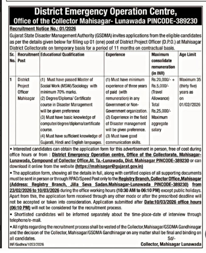 DPO Recruitment 2026: ગુજરાત રાજ્ય આપત્તિ વ્યવસ્થાપન સત્તામંડળ (GSDMA) હેઠળ મહીસાગર જિલ્લા કલેક્ટર કચેરી દ્વારા જિલ્લા પ્રોજેક્ટ અધિકારી (District Project Officer) ના એક પદ માટે ઉમેદવારો પાસેથી અરજીઓ મંગાવવામાં આવી છે. આ ભરતી કરારધારી ધોરણે (Contractual Basis) 11 મહિના માટે કરવામાં આવી રહી છે. જો તમે સમાજસેવા અને આપત્તિ વ્યવસ્થાપન ક્ષેત્રે કારકિર્દી બનાવવા માંગો છો, તો આ તક ચૂકવી ન જાવ.