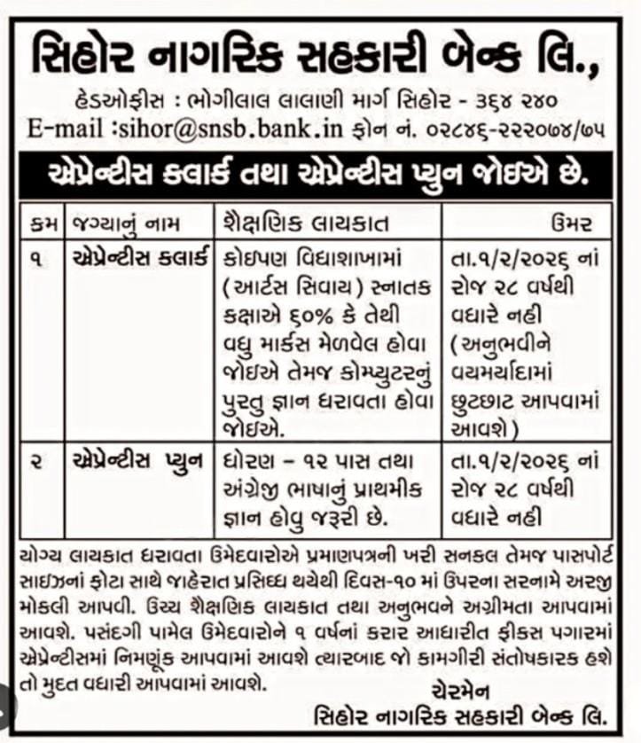 સિહોર નાગરિક સહકારી બેંક લિમિટેડમાં એપ્રેન્ટીસ ક્લાર્ક અને એપ્રેન્ટીસ પ્યુનની આ ભરતી એ ગુજરાતના બેરોજગાર યુવાનો માટે એક સુવર્ણ તક છે. 7 ક્લાર્ક અને 2 પ્યુનની આ જગ્યાઓ માટે સ્પર્ધા થશે, પરંતુ જો તમારી પાસે યોગ્ય લાયકાત અને થોડો અનુભવ છે, તો તમારી પસંદગી થવાની સંભાવના વધી જાય છે.