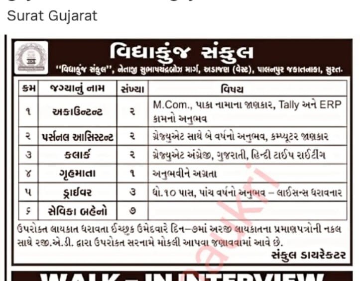 વિદ્યાકુંજ સંકુલ, સુરત એ શૈક્ષણિક અને સામાજિક સંસ્થા તરીકે ઓળખાય છે. અહીં કામ કરવાનો અનુભવ ખૂબ જ સારો મળે છે. જો તમે ઉપરોક્ત પદો માટે યોગ્ય છો અને સંસ્થામાં ફાળો આપવા ઈચ્છતા હોવ, તો નિર્ધારિત પ્રક્રિયા અનુસાર અરજી કરો. અરજી કરવાની છેલ્લી તારીખ નજીક છે, એટલે શક્ય તેટલી જલ્દી તમારી અરજી તૈયાર કરી નાખો.