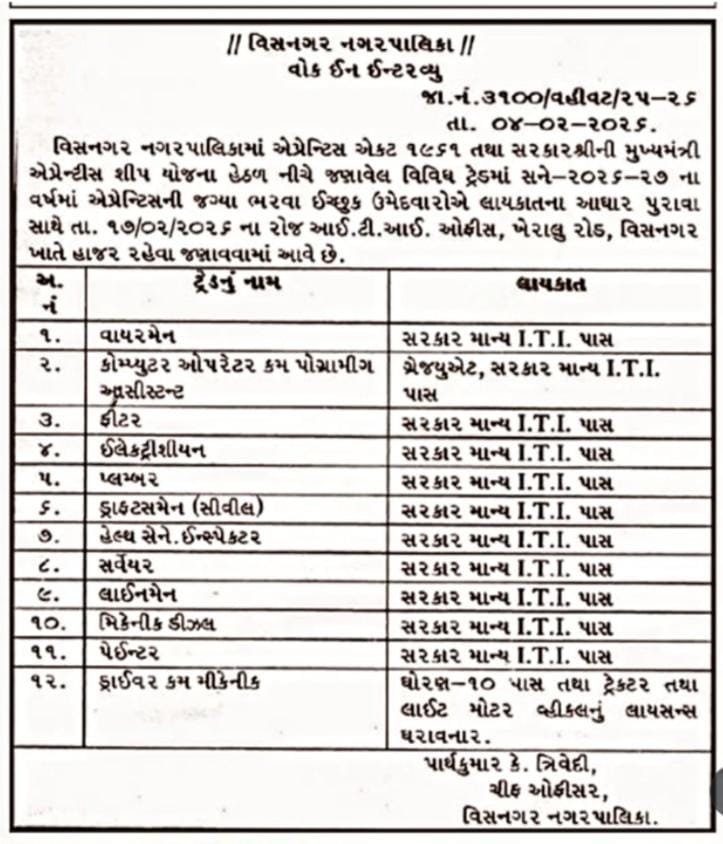 વિસનગર નગરપાલિકાની આ એપ્રેન્ટીસશીપ ITI પાસ યુવાનો માટે સીધા ઇન્ટરવ્યૂ દ્વારા નોકરી મેળવવાની ઉત્તમ તક છે. યાદ રાખો, તારીખ 17-02-2026 છે અને સ્થળ ITI ઓફીસ, ખેરાલુ રોડ, વિસનગર છે. તમારા દસ્તાવેજો પૂરા રાખો, તકનીકી જ્ઞાનની સમીક્ષા કરો અને આત્મવિશ્વાસથી ઇન્ટરવ્યૂ આપો. તમારી કારકિર્દીની શરૂઆત માટે શુભેચ્છાઓ!